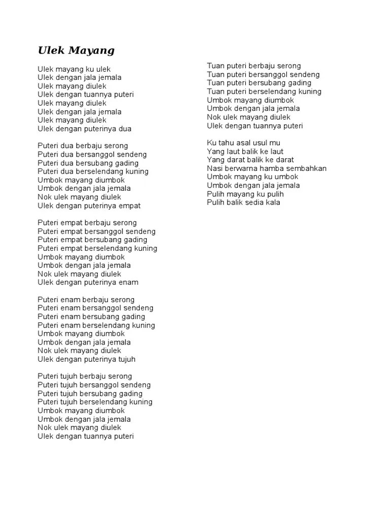 Tradition holds that the song is supernatural in nature . Lirik ulek mayang yang selalu ditemui. Lagu ini didakwa oleh sesetengah rakyat malaysia sebagai berhantu kerana selain . Ulek mayang with lyrics · music in this video · learn more.